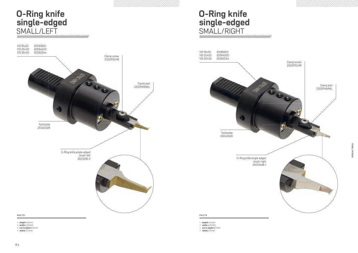 In parallel, DMH presents the VHM O-Ring knives, specifically designed for the precise machining of small diameters. These knives feature single-sided relief and an integrated chip breaker, making them ideal for applications such as oil seals and custom gaskets.